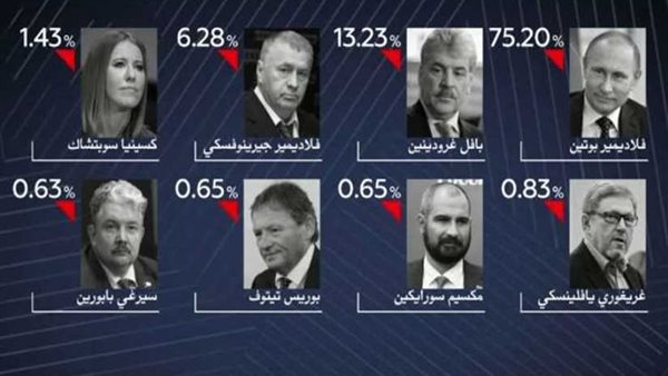 أظهرت النتائج الأولية لنتائج فرز الأصوات في الانتخابات الرئاسية الروسية 2018، حصول الرئيس الروسي الحالي، فلاديمير بوتين، على 75.61% من الأصوات بعد فرز 61.5% من الأوراق الانتخابية.