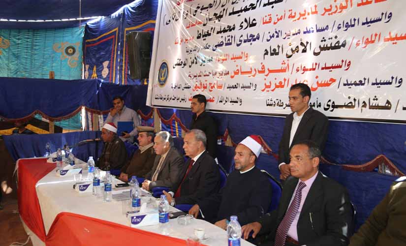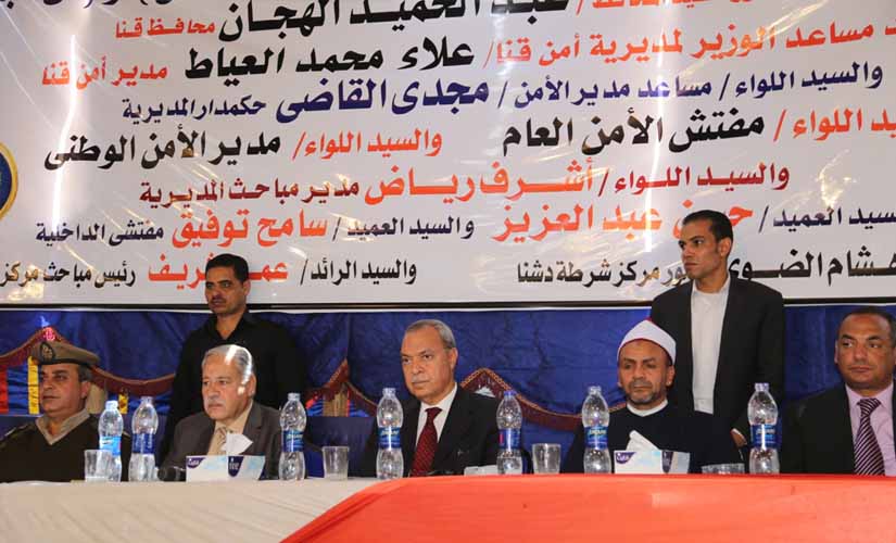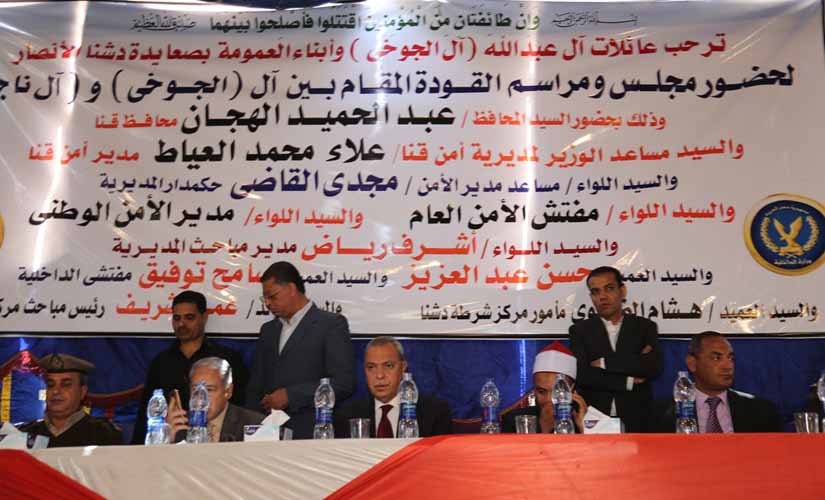 شهد اللواء عبد الحميد الهجان، محافظ قنا، واللواء علاء العياط، مدير أمن قنا، جلسة صلح "القوده" بين أبناء العمومة من عائلات عبدالله "آل الجوخي" و"آل ناجي"، بمدينة دشنا، وذلك بحضور عدد من أعضاء مجلس النواب وعدد كبير من القيادات الأمنية والتنفيذية والشعبية والدينية من رجال الدين الإسلامي والمسيحي وكبار العائلات والقبائل، بالإضافة إلى عدد كبير من أبناء العائلتين وأبناء مركز دشنا.