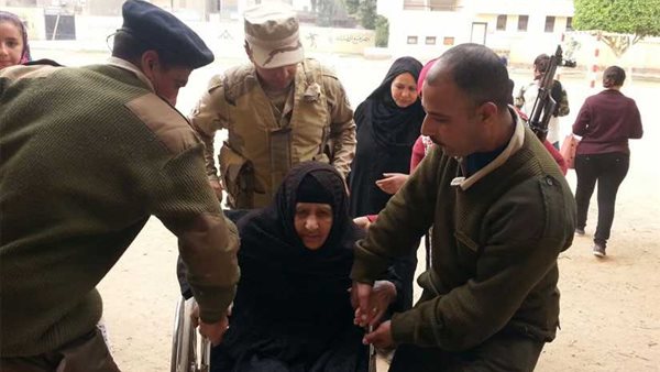 في لفته إنسانيه حمل أفراد الشرطة والجيش سيدة مسنة تجلس على كرسي متحرك لكي تتمكن من الإدلاء بصوتها بلجنتها بالمدرسة الثانوية بمركز القوصية في أسيوط