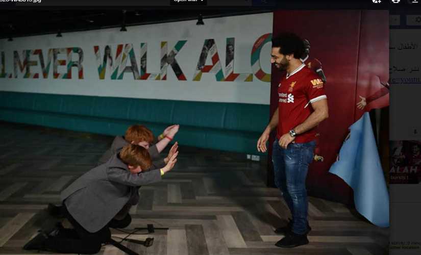 صلاح أبدى سعادته بقضاء اليوم مع الأطفال الذين غافلهم وهم يعلقون على مباراة أرسنال وليفربول ليخرج من صورة معلقه له على الحائط ويفاجئهم.
