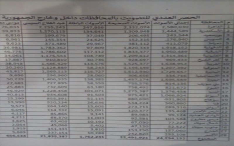 وجاء عدد المقيدين بقاعدة بيانات الناخبين 59 مليونا و78ألفا و138ناخبا، وعدد من أدلوا بأصواتهم في الخارج 157الفا و60 ناخبا، بعد احتساب الخارج، وعدد المقيدين في الداخل فقط 58 مليونا و921 ألفا و78 ناخبا.