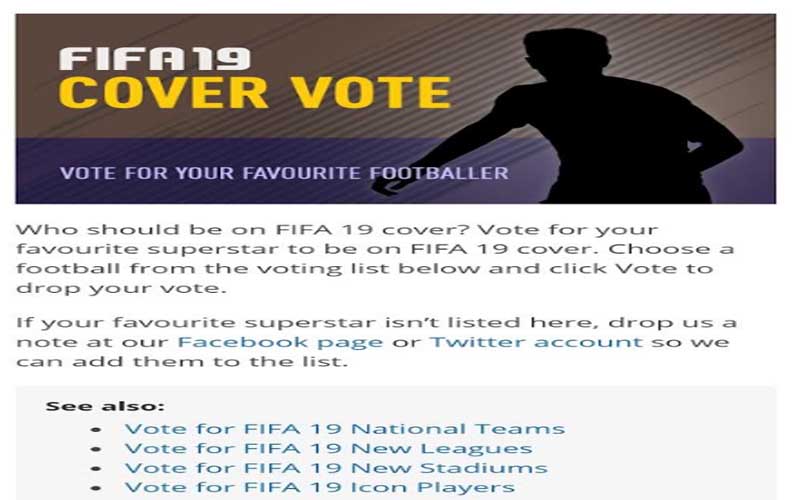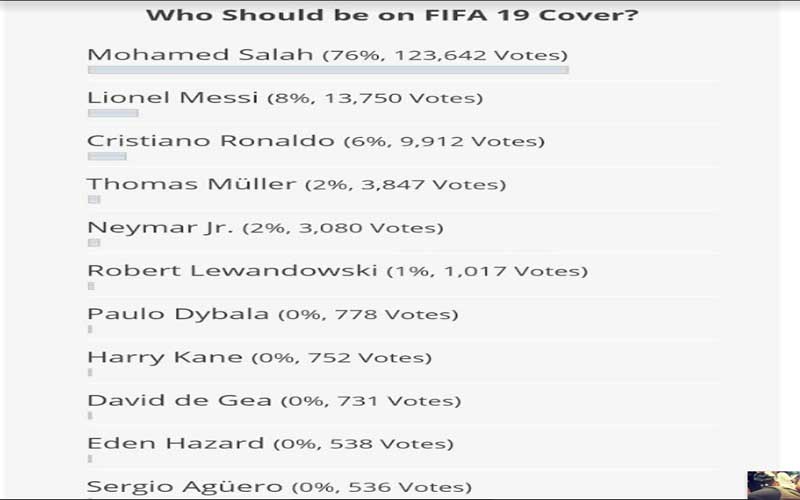 تصدَّر النجم المصري العالمي محمد صلاح تصويت موقع "سلسلة ألعاب فيديو فيفا"، الذي أعلن عن إجراء تصويت لاختيار اللاعب الذي من المقرر أن توضع صورته على غلاف إصدار "فيفا ١٩".