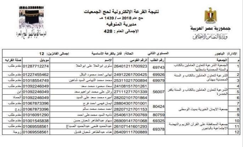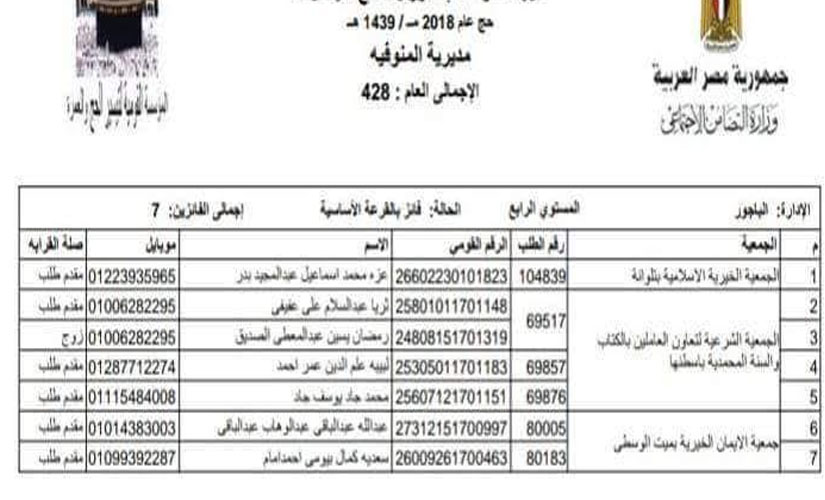 أعلنت وزارة التضامن الاجتماعي نتيجة القرعة الإلكترونية لحج الجمعيات لعام 2018م-1439ھ، بمحافظة المنوفية، حيث بلغ عدد إجمالي الفائزين 428 مواطن.