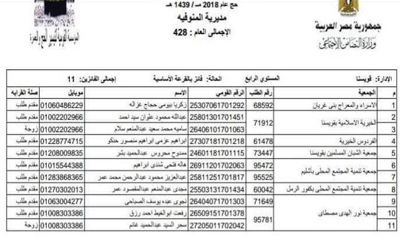 أعلنت وزارة التضامن الاجتماعي نتيجة القرعة الإلكترونية لحج الجمعيات لعام 2018م-1439ھ، بمحافظة المنوفية، حيث بلغ عدد إجمالي الفائزين 428 مواطن.