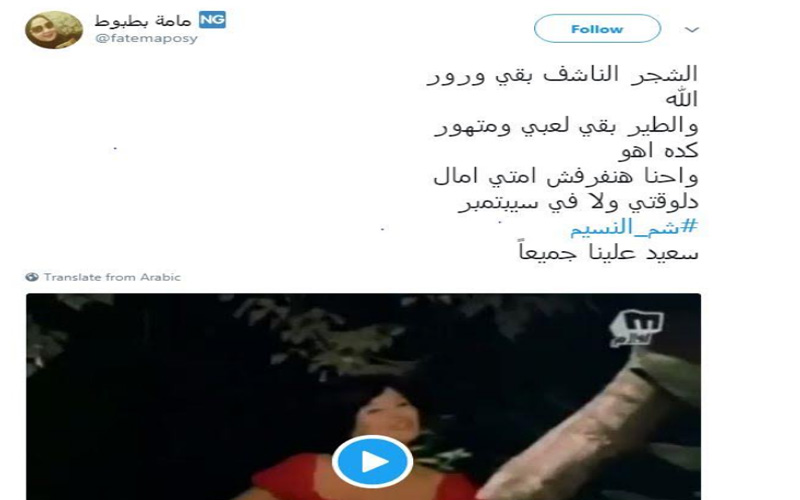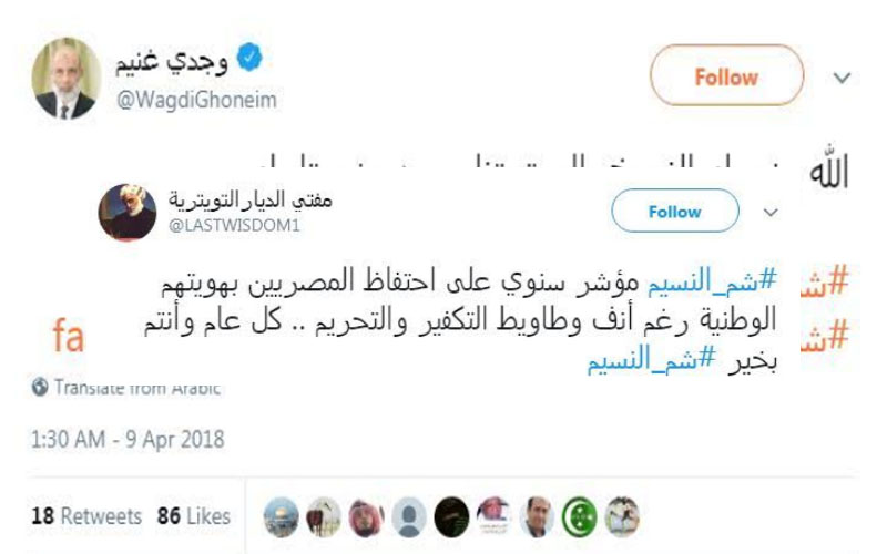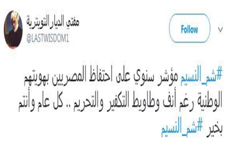 وقال حساب أحد الشباب الذي لقب نفسه بمفتي الديار التويترية #شم_النسيم مؤشر سنوي على احتفاظ المصريين بهويتهم الوطنية رغم أنف وطاويط التكفير والتحريم.. كل عام وأنتم بخير
