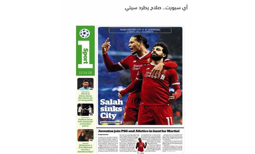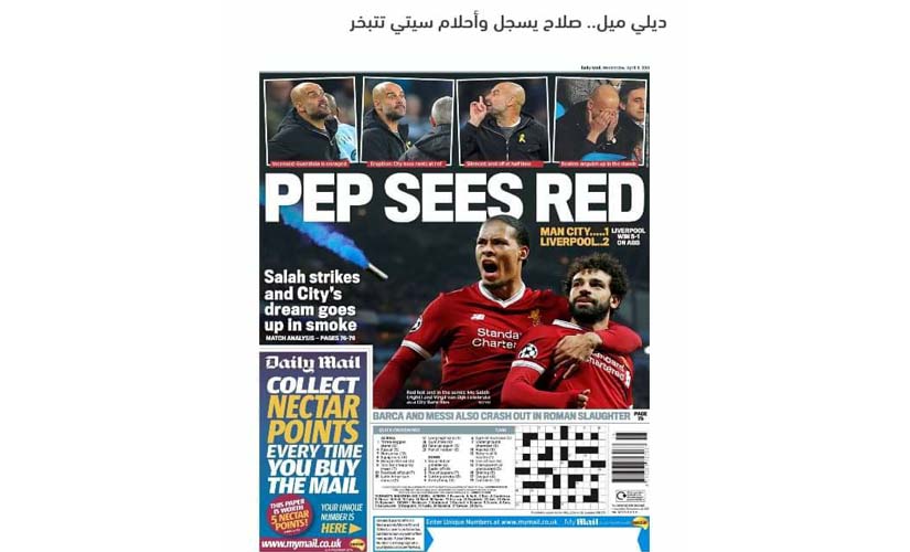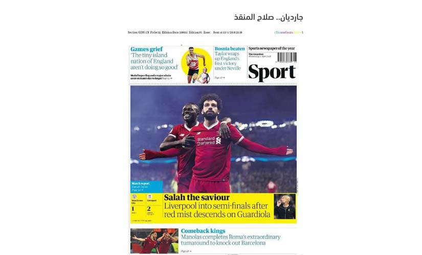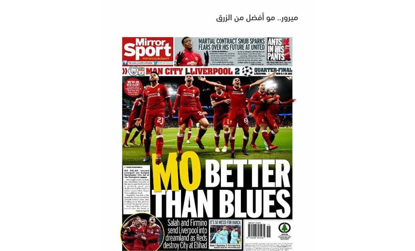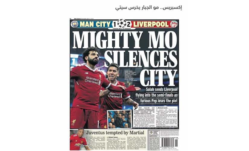 تصدر الدولي المصري محمد صلاح أغلفة الصحف الرياضية الإنجليزية الشهيرة بعد قيادته لفريقه ليفربول للتأهل إلى نصف نهائي دوري أبطال أوروبا، على حساب مانشستر سيتي.