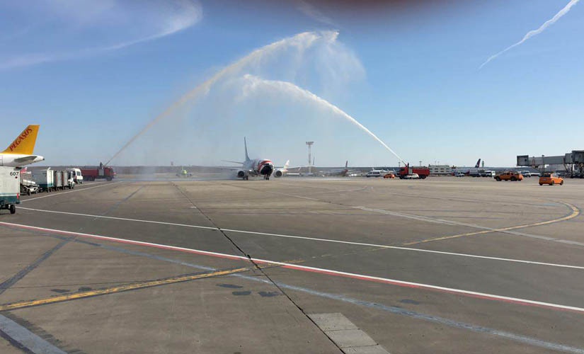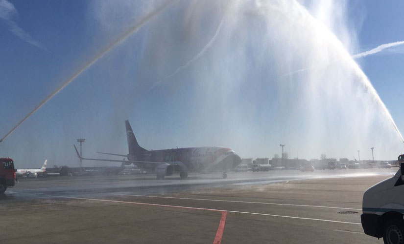رش المياه على جسم الطائرة من الجانبين احتفالًا بوصولها