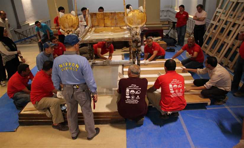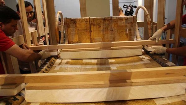 ومن جانبه، قال حسن كمال، مدير عام الشئون الفنية بالمتحف المصري الكبير، إنه تم تأمين الأماكن الضعيفة بالقطع قبل تغليفها ونقلها من خلال إجراء أعمال الترميم الأولى والتوثيق للعجلة والسرير. وأضاف أنه بنقل السرير والعجلة الحربية تكون جميع الآثار العضوية المدرجة ضمن المشروع المصري الياباني تم الانتهاء من نقلها، وسيتم استكمال اأعمال الترميم للسرير والعجلة داخل معمل الأخشاب.