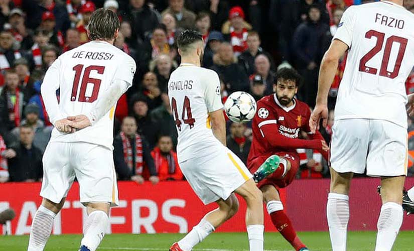 افتتح خماسية ليفربول، الدولي المصري محمد صلاح، هداف الريدز التاريخي، بهدف أول على طريقته المعهودة بيسراه في أقصى يمين حارس روما عند الدقيقة 35 واضاف اللاعب نفسه الهدف الثاني عند الدقيقة 45 بفضل سرعته وبلمسة سحرية من زميله فيرمينيو وضعها المصري من فوق حارس روما بكل سهولة، لينهي الشوط الأول بثنائية نظيفة أمام ذئاب روما.