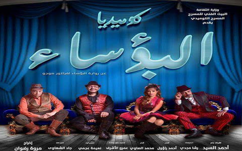 مسرحية "كوميدي البؤساء" مستوحاة من رواية "البؤساء" لفيكتور هوجو، معالجة وإخراج مروة رضوان، تحت إشراف أحمد السيد مدير المسرح الكوميدي ودكتور إسماعيل مختار رئيس البيت الفني للمسرح ودكتور خالد جلال رئيس قطاع الإنتاج وبطولة رنا سماحة ومحمود عزت ورامي الطمباري ومحمد عبده وعمرو كمال بدير ومريم البحراوي ورانيا النجار ومحمد حسن رمضان ومايا ماهر ومحمود خالد ورودي سماحة وزينة زين ويوسف زكري واكرم عمران وتصميم الديكور والإضاءة لعمرو الاشرف وتصميم الأزياء نعيمة عجمي واستعراضات رشا مجدي واشعار أحمد حسن راءول وموسيقى وألحان محمد الصاوي وتوزيع حازم السعيد أما الجرافيك والمادة الفيلمية لمحمد حجازي وتصوير فوتوغرافي لمارتن آدم.