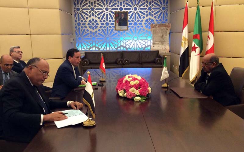 أكد وزراء خارجية مصر وتونس والجزائر رفض كل أشكال التدخل الخارجي في ليبيا والذي يؤدي الى تصعيد داخلي من شأنه أن يقوض العملية السياسية وإطالة الأزمة واستهداف ليس فقط الأمن والإستقرار في ليبيا بل وأيضا دول الجوار.