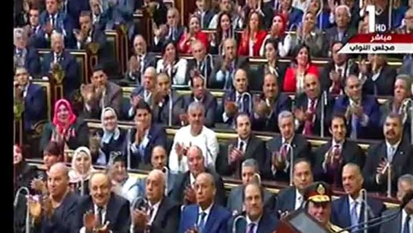 كما ضجت القاعة الرئيسية لمجلس النواب بالتصفيق الحاد من النواب فور دخول السيسي قاعة البرلمان.