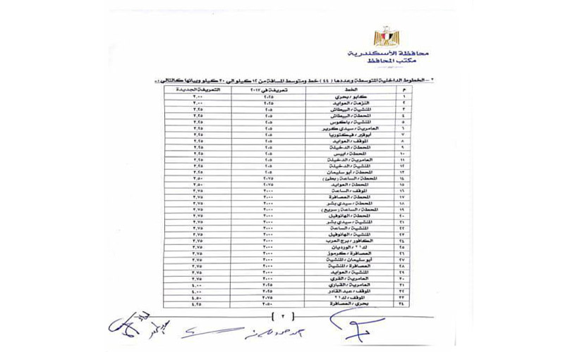 أصدرت محافظة الإسكندرية اليوم التعريفة الجديدة لأسعار المواصلات الداخلية والخارجية للمواقف بالمحافظة، وذلك بعد قرار مجلس الوزراء بإقرار زيادة المنتجات البترولية والمحروقات، وقد شددت المحافظة على ضرورة اتباع تلك التعريفة وعمل لافتات بها بالمواقف.