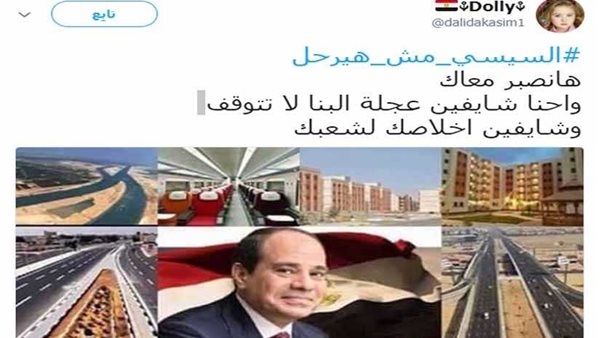 وتنوعت التغريدات خلال الهاشتاج، حيث قالت نانا: "السيسى هيكمل مدته وهننتخب رئيس من جيش مصر بعده، ثم يأتى السيسى مرة أخرى، إحنا كده واللى مش عاجبه يطفش، الشعب يريد نفى الإخوان من مصر"، فيما قالت داليدا قاسم: "هانصبر معاك وإحنا شايفين عجلة البناء لا تتوقف وشايفين إخلاصك لشعبك".