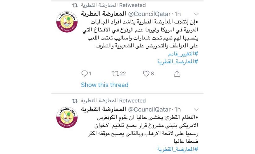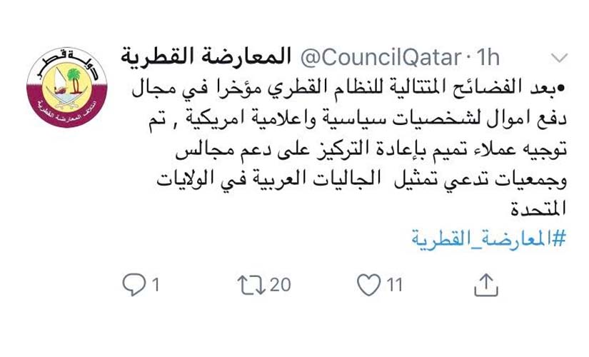 وفضحت المعارضة خطة تميم في عده تغريدات على صفحتها الرسمية بموقع التواصل الاجتماعي "تويتر" وتضمنت: بعد الفضائح المتتالية للنظام القطري مؤخرا في مجال دفع أموال لشخصيات سياسية وإعلامية أمريكية، تم توجيه عملاء تميم بإعادة التركيز على دعم مجالس وجمعيات تدعي تمثيل الجاليات العربية في الولايات المتحدة.