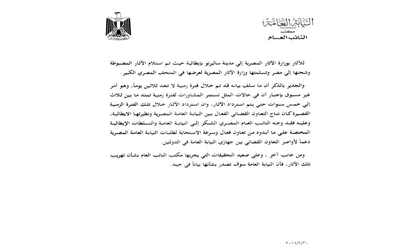 النيابة العامة: مصر تسلمت الأثار المصرية المهربة إلى إيطاليا