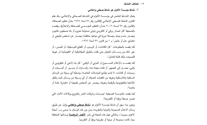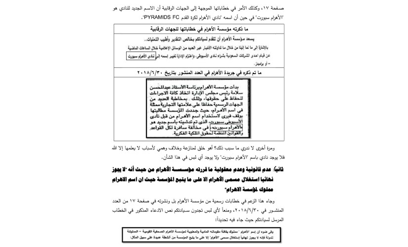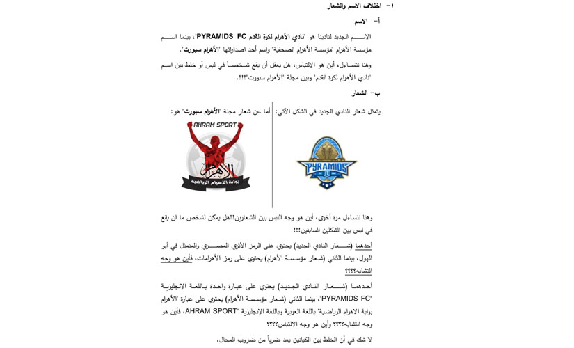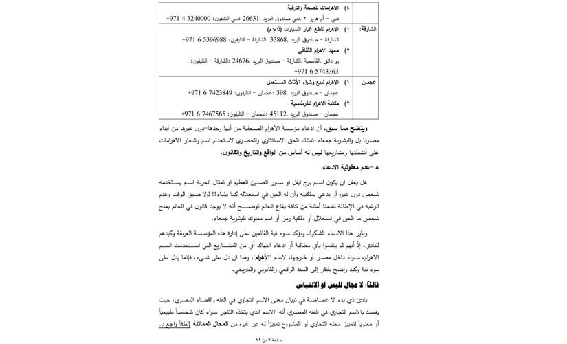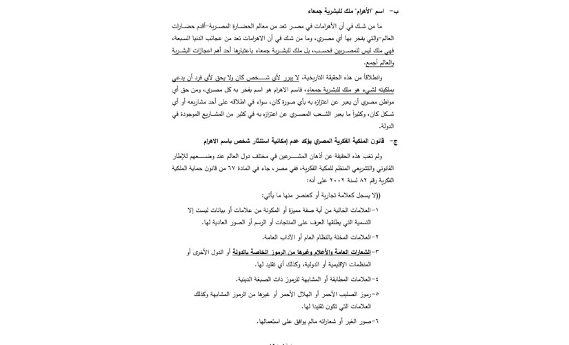 وأوضح التقرير عدم قانونية وعدم معقولية ما قررته مؤسسة الأهرام من حيث لا يجوز نهائيا استغلال مسمى الأهرام إلا على ما يتبع المؤسسة، حيث إن اسم الأهرام مملوك لمؤسسة الأهرام، مشيرا إلى أن هناك مئات المشروعات والشركات باسم الأهرام في مصر يتراوح عددها أكثر من 50 شركة، وإن اسم الأهرام اسم للبشرية جمعاء.