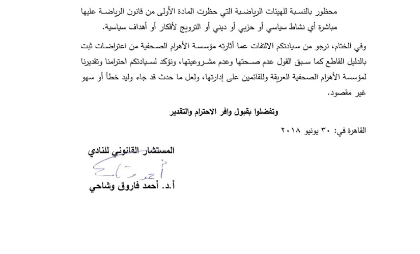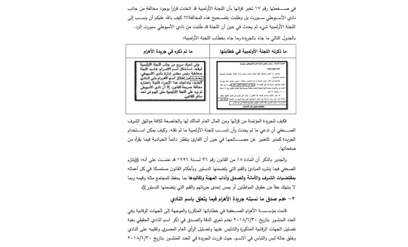 وأشار التقرير إلى عدم صحة ما نسبته الأهرام إلى اللجنة الأولمبية بأنها اتخذت قرارا بوجود مخالفة من جانب نادي الأسيوطي سبورت في استغلال اسم مؤسسة الأهرام، مؤكدا عدم صدق ما نسبته الأهرام في خطاباتها المتكررة إلى الجهات الرقابية فيما يتعلق باسم النادي.