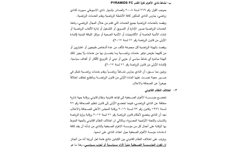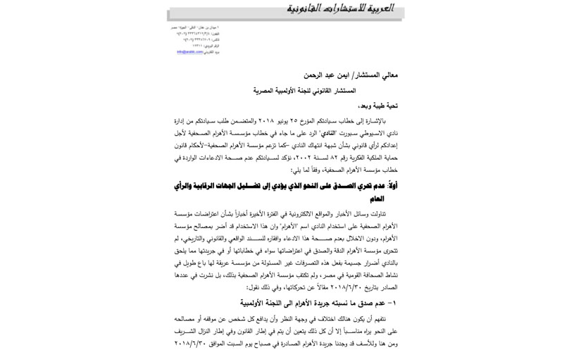 حصلت «بوابة روزاليوسف» على التقرير المرسل إلى المستشار القانوني للجنة الأولمبية المصرية الذي يرد على ادعاءات مؤسسة الأهرام حول نشر أخبار تفيد استخدام «نادي بيراميدز» اسم مؤسسة الأهرام على النحو الذي يؤدي إلى تضليل الجهات الرقابية والرأي العام.