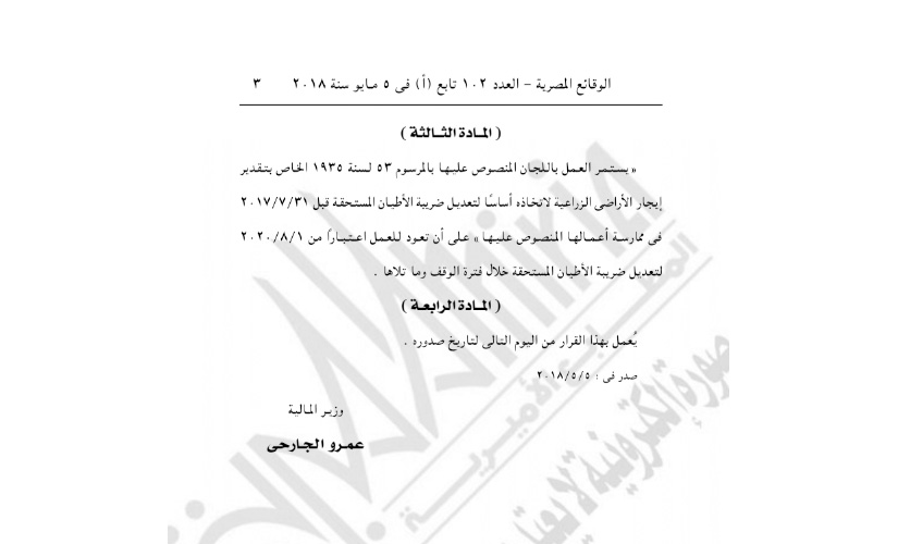 نشرت الجريدة الرسمية ، قرار وزارة المالية رقم 193 لسنة 2018، بشأن بداية مـــدة وقـــف العـمـــل مؤقتــًا بأحـكــام القـــانــون رقــم 113 لسنة 1939 الخاص بضريبة الأطيان اعتبارًا من 2017/8/1 وحتـى 2020/7/31 .