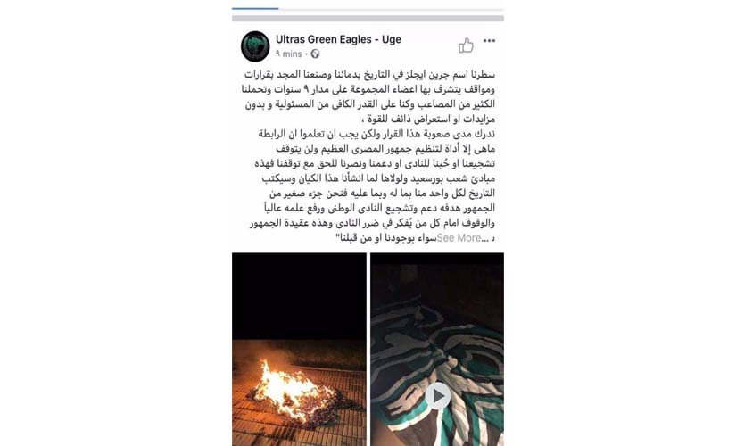 وقال البيان:"سطرنا اسم جرين ايجلز في التاريخ بدمائنا وصنعنا المجد بقرارات ومواقف يتشرف بها اعضاء المجموعة على مدار ٩ سنوات وتحملنا الكثير من المصاعب وكنا على القدر الكافى من المسئولية و بدون مزايدات او استعراض ذائف للقوة ،ندرك مدى صعوبة هذا القرار ولكن يجب ان تعلموا ان الرابطة ماهى إلا أداة لتنظيم جمهور المصرى العظيم ولن يتوقف تشجيعنا او حُبنا للنادى او دعمنا ونصرنا للحق مع توقفنا فهذه مبادئ شعب بورسعيد ولولاها لما انشأنا هذا الكيان وسيكتب التاريخ لكل واحد منا بما له وبما عليه".