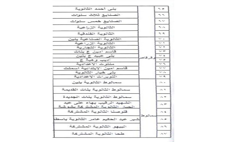 وجاءت كالتالي، التعليم الثانوي العام: الحد الأدنى للقبول بمدارس التعليم الثانوي العام للمدارس الرسمية الحكومية 200 درجة، والحد الأدنى للقبول بمدارس التعليم الثانوي الخاص 170 درجة.