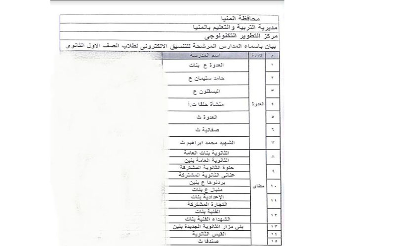 كان اللواء عصام البديوي، محافظ المنيا قد اعتمد قواعد التنسيق الإلكتروني للقبول بالتعليم الثانوي العام والفني لطلاب نهاية مرحلة التعليم الأساسي الشهادة الإعدادية، للعام الدراسي 2017/2018 والمتقدمين لمدارس التعليم الثانوي العام والفني 2018/2019.