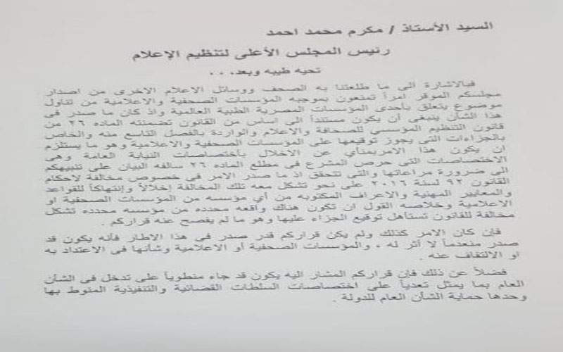 وختم البيان: "السيد الفاضل رئيس المجلس طال الانتظار ليصدر عنكم ما يتحقق به تدارك هذا التدخل في الاختصاص في ضوء الإطار المحدد بالمادة 26 من قانون التنظيم المؤسسي للصحافة والإعلام الذي أسلفنا شرحه ويحمل ما يتضمن الإجابة على التساؤلات التي أوردناها في مقدمة هذا الكتاب أمَّا وأنَّه لم يصدر فأرجو إعداد تلك الأجوبة للإدلاء بها لنيابة أمن الدولة العليا التي أمرنا بمثولكم أمامها".