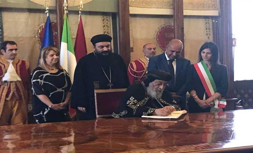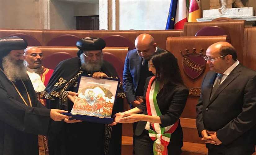 زار قداسة البابا تواضروس الثاني، اليوم، عمدة مدينة روما الدكتورة فرجينيا راججي، بمقر بلدية روما بالكامبودليو واستقبلت راججي قداسته أمام مقر البلدية.