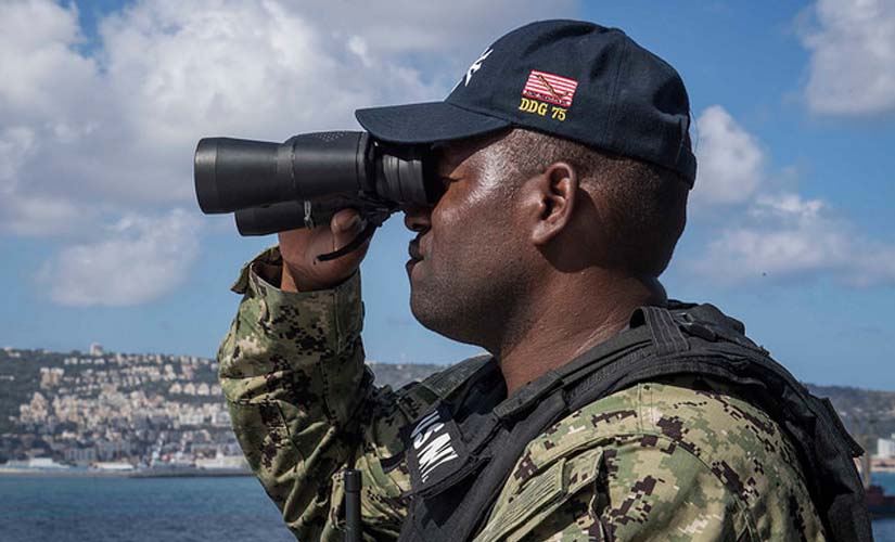 ونشر الحساب الرسمي للبحرية الأمريكية صورا لقائد السفينة وهو ينظر من خلال المنظار مستطلعاً فضاء البحر أمام السفينة والعاملين والجنود العاملين وهم يرفعون الحبال للمغادرة.