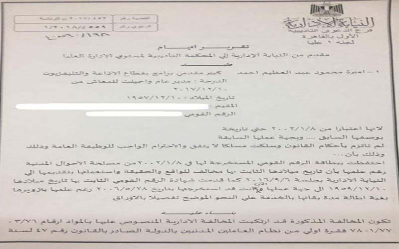 وافق المستشار محمد إسماعيل نافع، نائب رئيس هيئة النيابة الإدارية في القضية رقم 198 لسنة 60 قضائية عليا على إحالة المذيعة أميرة عبد العظيم، كبير مقدمي برامج في ماسبيرو للمحاكمة لإحتفاظها ببطاقة رقم قومي رغم علمها بتزويرها بقصد إطالة مدة بقائها في الخدمة لمدة عامين
