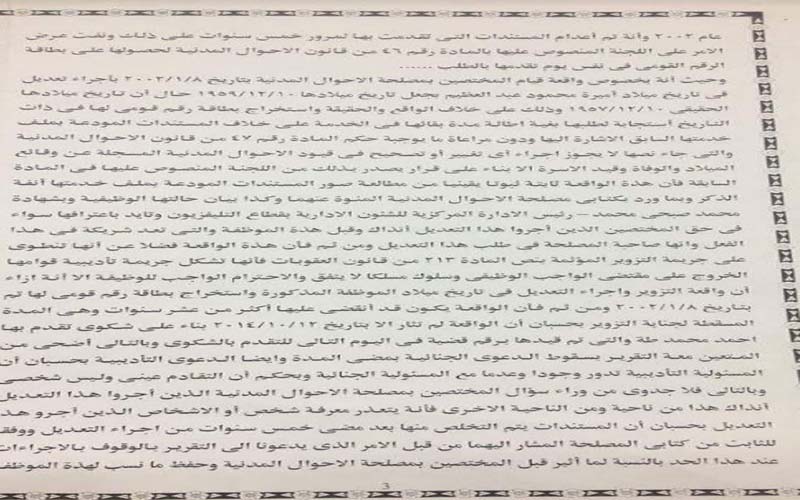 وبشأن واقعة قيام المختصين بمصلحة الأحوال المدنية بإجراء تعديل فى تاريخ ميلاد المتهمة بجعل تاريخ الميلاد 10 ديسمبر 1959 رغم أن تاريخ ميلادها الحقيقى 10 ديسمبر 1957 واستخراج بطاقة رقم قومى لها فى ذات اليوم استجابة لطلبها بقصد إطالة مدة بقائها فى الخدمة لمدة عامين، ودون مراعاة ما يوجبه حكم المادة رقم 47 من قانون الاحوال المدنية والتى جاء نصها لا يجوز اجرء اي تغيير او تصحيح فى قيود الاحوال المدنية المسجلة عن وقائع الميلاد والوفاة وقيد الأسرة الا بناء على قرار يصدر بذلك من اللجنة المنصوص عليها فى المادة السابقة، قالت النيابة الإدارية ان هذه الواقعة ثابتة ثبوتا يقينا بما ورد بمذكرة مصلحة الأحوال المدنية وكذا بيان حالة المتهمة الوظيفية وشهادة رئيس الادارة المركزية للشئون الادارية بقطاع التليفزيون واعترافها سواء فى حق المختصين الذين أجروا هذا التعديل أنذاك وهذه الباحثة القانونية التى تعد شريكة فى هذا الفعل، وأنها صاحبة المصلحة فى طلب هذا التعديل ومن ثم فأن هذه الواقعة فضلا عن انها تنطوى على جريمة التزوير المؤثمة بنص المادة 213 من قانون العقوبات فأنها تشكل جريمة تأديبية الا أن واقعة التزوير واجراء التعديل فى تاريخ ميلاد المتهمة واستخراج بطاقة رقم قومى لها تم بتاريخ 8 يناير 2002 ومن ثم فأن الواقعة يكون قد انقضى عليها أكثر من عشر سنوات وهى المدة المسقطة لجناية التزوير وبالتالي يتعين معه التقرير بسقوط الدعوى الجنائية بمضى المدة وأيضا الدعوى التأديبية بحسبان أن المسؤلية التأديبية تدور وجودا وعدما مع المسؤلية الجنائية، حيث لا جدوى من وراء سؤال المختصين بمصلحة الأحوال المدنية الذين أجروا التعديل لأن المستندات يتم التخلص منها بعد مضي خمس سنوات من اجراء التعديل الأمر الذى دعا النيابة الى التقرير بالوقوف بالاجراءات عند هذا الحد بالنسبة لما أثير في حق المختصين بمصلحة الأحوال المدنية وحفظ ما نسب للباحثة القانونية في هذا الشأن لسقوط الدعوى التأديبية بمضي المدة مع التقرير بالاوجه لإبلاغ النيابه العامة