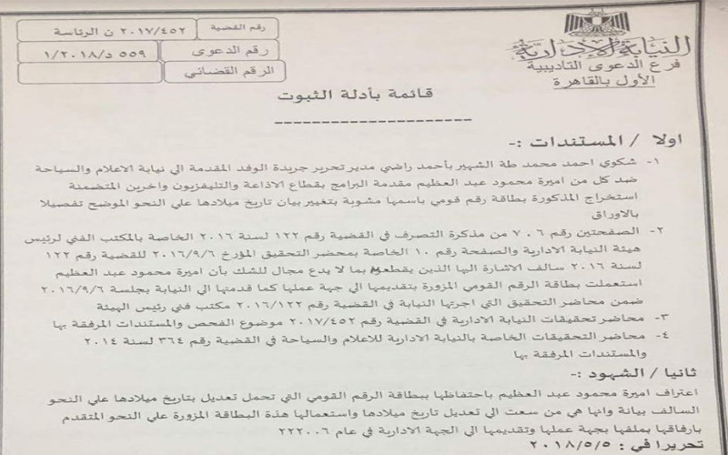 كشفت تحقيقات إسراء أحمد الهرمي، رئيس النيابة أن أميرة محمود عبد العظيم، كبير مقدمي برامج بقطاع التليفزيون خلال الفترة من 8 يناير 2002 حتى إحالتها للمعاش في ديسمبر 2017 إحتفظت ببطاقة الرقم القومي المستخرجة لها في 8 يناير 2002 من مصلحة الأحوال المدنية رغم علمها بأن تاريخ ميلادها الثابت بها مخالف للواقع والحقيقة بقصد إطالة مدة بقائها في الخدمة وتأخير إحالتها للمعاش لمدة عامين