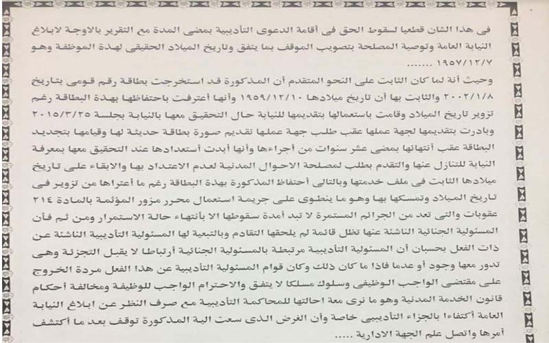 إستخرجت بطاقة رقم قومي بها تاريخ ميلاد مزور لتأخير إحالتها للمعاش عامين