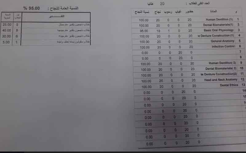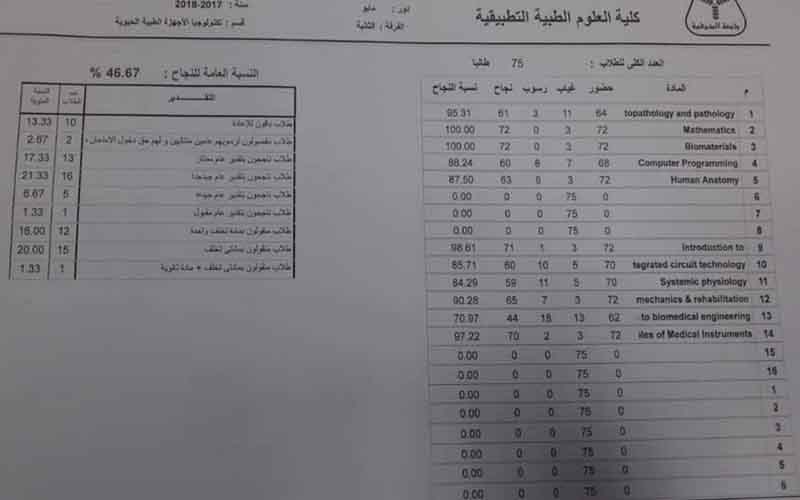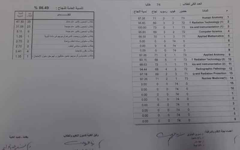 وبلغت نسبة النجاح بقسم المختبرات الطبية ٨٩%، وقسم تكنولوجيا الأجهزة الطبية الحيوية ٤٧%، وقسم تكنولوجيا الاستعاضة الصناعية للأسنان ٩٥%، وقسم علوم الأشعة ٨٦%.