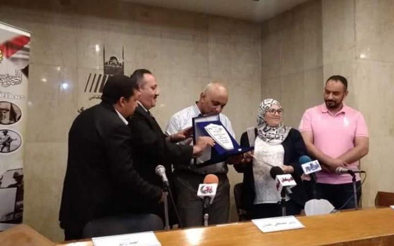 وأهدى مدير المكتبة، درع قطاع شؤون الإنتاج الثقافي إلى أسرة البطل "فاروق عليش" وشهادة تقدير.