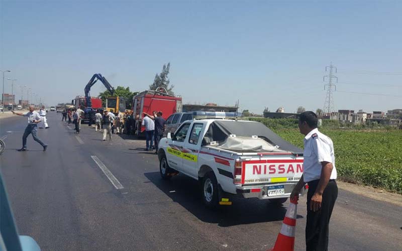بالصور.. رفع آثار حادث انقلاب سيارة محملة بمواد بترولية بالطريق الزراعي
