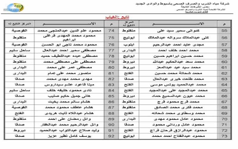 أعلنت شركة مياه الشرب والصرف الصحي بأسيوط والوادي الجديد، اليوم الاثنين نتيجة الاختبار التحريري للمسابقة رقم (3) لسنة 2018 للمتقدمين لوظيفة محصل قارئ بالعمولة التي عقدت بمدرجات كلية التجارة.