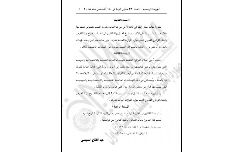 ننشر قانون ضم نسبة من أرصدة الصناديق الخاصة وفوائض "الهيئات" لخزانة الدولة