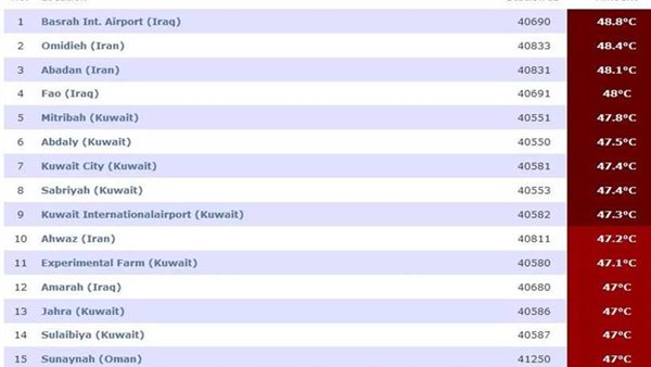 ونشرت محطة "بلاسيرفيلي" في كاليفورنيا الأمريكية، جدولاً بأعلى درجات الحرارة في العالم، والتي بينت أعلى 15 مدينة سجلت درجات حرارة بالجدول وتصدرت البصرة الجدول بدرجة حرارة تقارب الـ49 درجة.