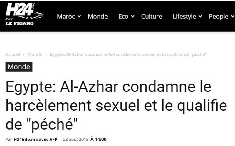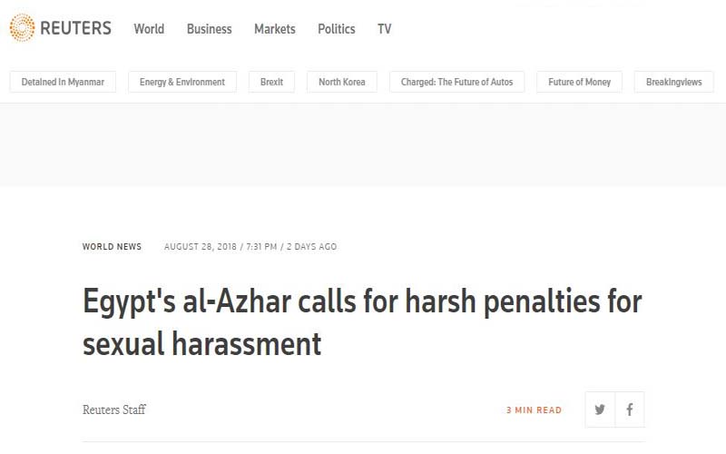 من ناحيته، أبرز موقع «ميدل إيست آي» البريطاني مطالبة الأزهر بضرورة تطبيق عقوبات رادعة ضد المتحرشين والتحرش بشكل عام، مع الدعوة لنشر الوعي بين الناس بمخاطر وأضرار التحرش.