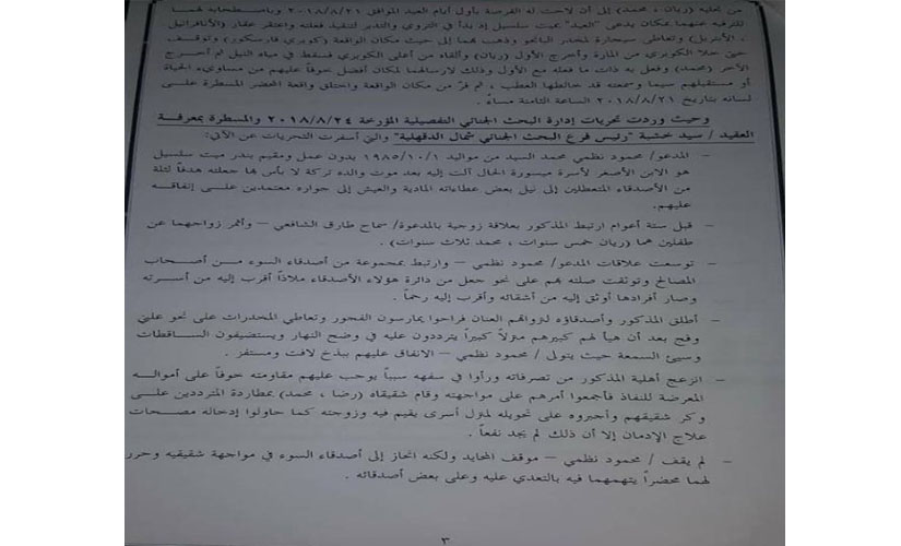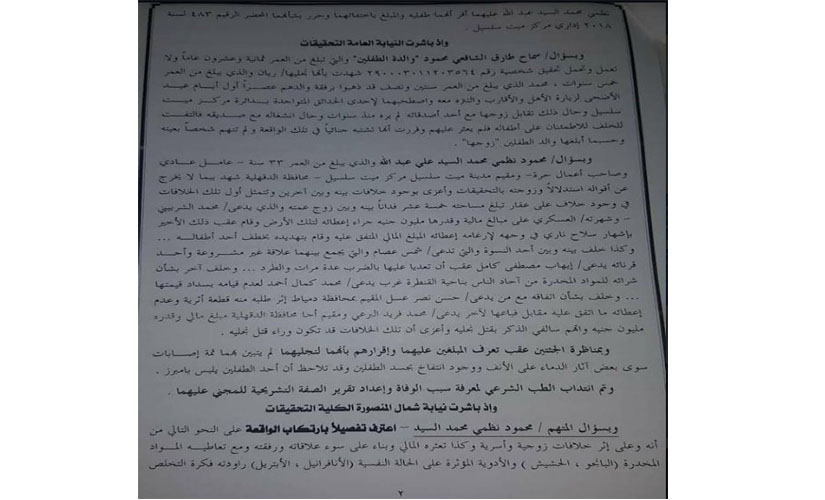 وتضمنت المذكرة إدلاء المتهم بعدة اعترافات لإبعاد الشبهات عنه، منها وجود خلافات مع زوج عمته على عقار، وتهديده له بخطف نجليه، وخلاف مع إحدى السيدات التي تربطه بها علاقة غير شرعية، وتعديه وصديقه عليها بالضرب والطرد عدة مرات، كما ادعى وجود خلافات مع أحد الأشخاص بمنطقة القنطرة غرب على سداد قيمة شراء مخدرات، ثم اتهم شخصين بقتل الطفلين بسبب خلاف على قطعة آثار.