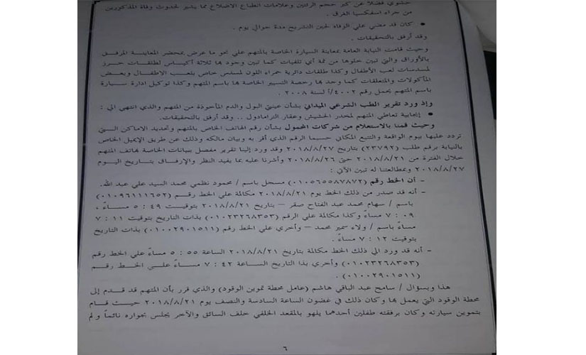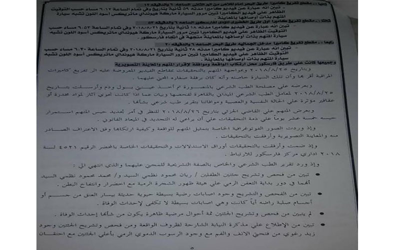 كما أثبتت المذكرة مواجهة المتهم بـ 4 مقاطع فيديو لكاميرات مراقبة، الأولى خاصة ببنزينة فارسكور وتظهر المتهم داخل سيارته ومعه طفل يخرج رأسه من الزجاج الخلفي، وكاميرات أخرى أمام الملاهي، وأول طريق الخضيري، ومدخل الجمالية، جميعهم يظهرون مرور سيارة تشيه سيارة المتهم في اتجاهها لفارسكور.