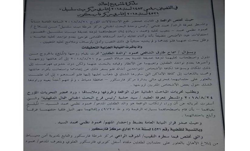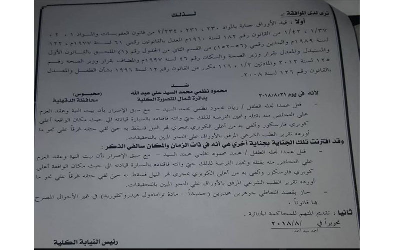 تقدمت نيابة شمال المنصورة الكلية، بمذكرة تفصيلية توصى بإحالة محمود نظمي، والد طفلي ميت سلسيل، لمحكمة الجنايات بتهمة قتلهما عمدًا.