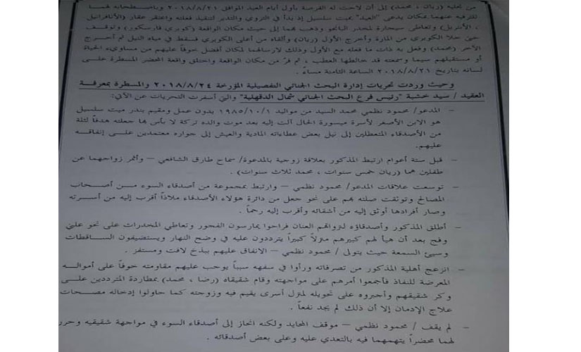 وفي وقت سابق، حرر المتهم محضرًا ضد شقيقيه، يتهمهما بالتعدي عليه وأصدقائه، بعدما حاولا إبعاده عنهم وإدخاله مصحات للعلاج من الإدمان، كما توترت علاقته بزوجته، وأجبره الجميع على نقل أسرته لمنزله الثاني، والابتعاد عن أصدقائه والتخلي عن حياته الخاصة.