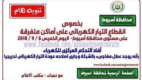وأعلنت محافظة أسيوط في بيان صادر عبر الصفحة الرسمية للمحافظة علي الفيس بوك، أن سبب انقطاع التيار الكهربائي عن معظم انحاء المحافظة ناتج عن عطل مفاجيء بالشبكة وجاري العمل علي إصلاحه.