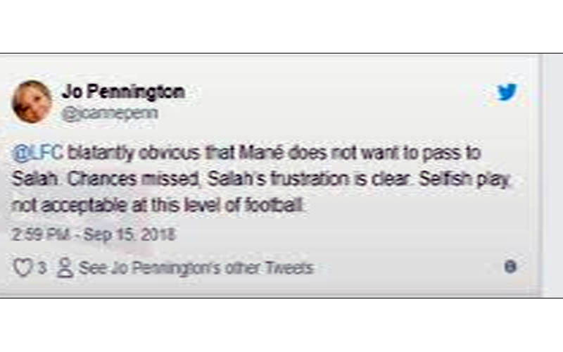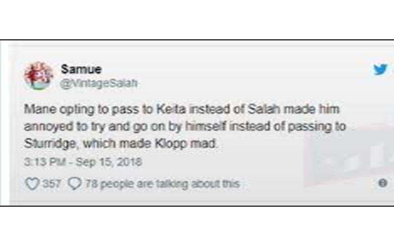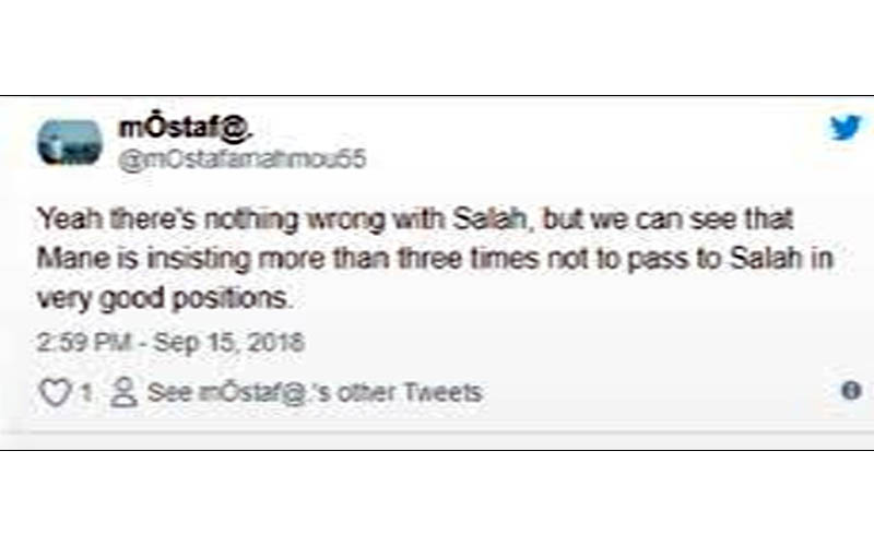 ووجهت عشاق ليفربول انتقاداتها إلى السنغالي ماني الذي تجاهل زميله ورفض التمرير له في أكثر من لعبة، رغم وجود المصري في موقع أفضل.