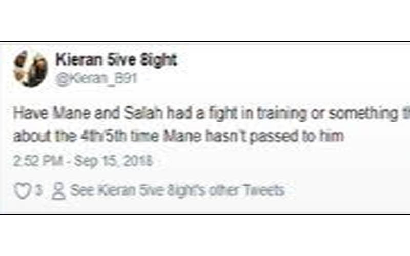 وتساءل أحد الجماهير على موقع "تويتر": "هل تعارك ماني وصلاح أثناء المران أم ماذا؟ هذه المرة الرابعة أو الخامسة التي لا يمرر فيها ماني".