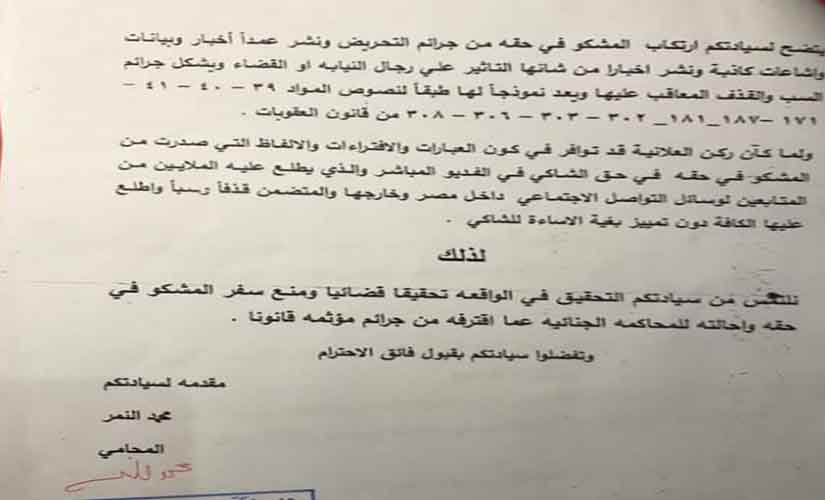 طالب البلاغ النائب العام بمنعه من سفر وإحالته للمحاكمة الجنائية لما اقترفه من جرائم.