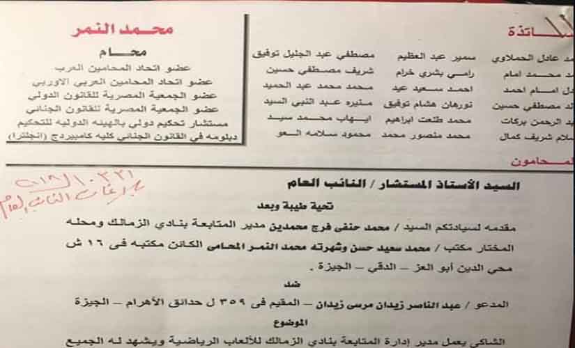 تلقى النائب العام بلاغا من محمد النمر المحامي ضد عبد الناصر زيدان مقدم البرامج بقناة ltc يتهمه بسب وقذف محمد حنفي مدير إدارة المتابعة بنادي الزمالك.